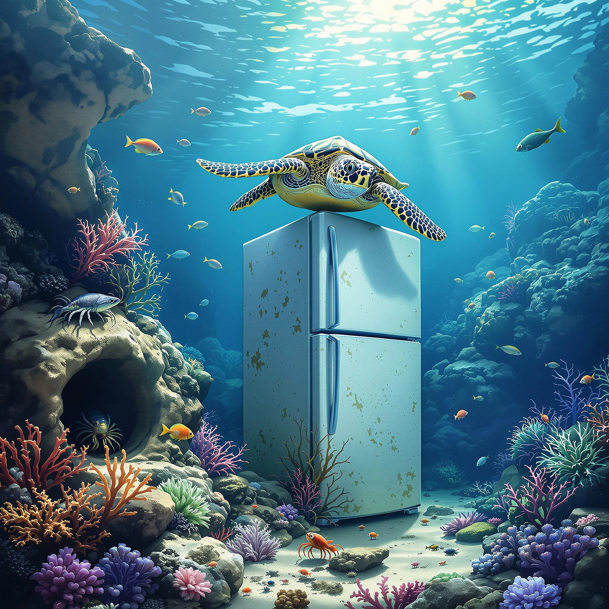 Create an underwater scene featuring a sea turtle swimming on top of a refrigerator, looking down with curiosity. The marine life around is abundant, with a large moray eel hiding in a hole, and a lobster hiding in another spot. Small shrimp are sitting on the rocks, alongside vibrant marine sea fans and corals. The background should capture the vivid colors and diversity of an underwater ecosystem, with various fish swimming around and sunlight filtering through the water.