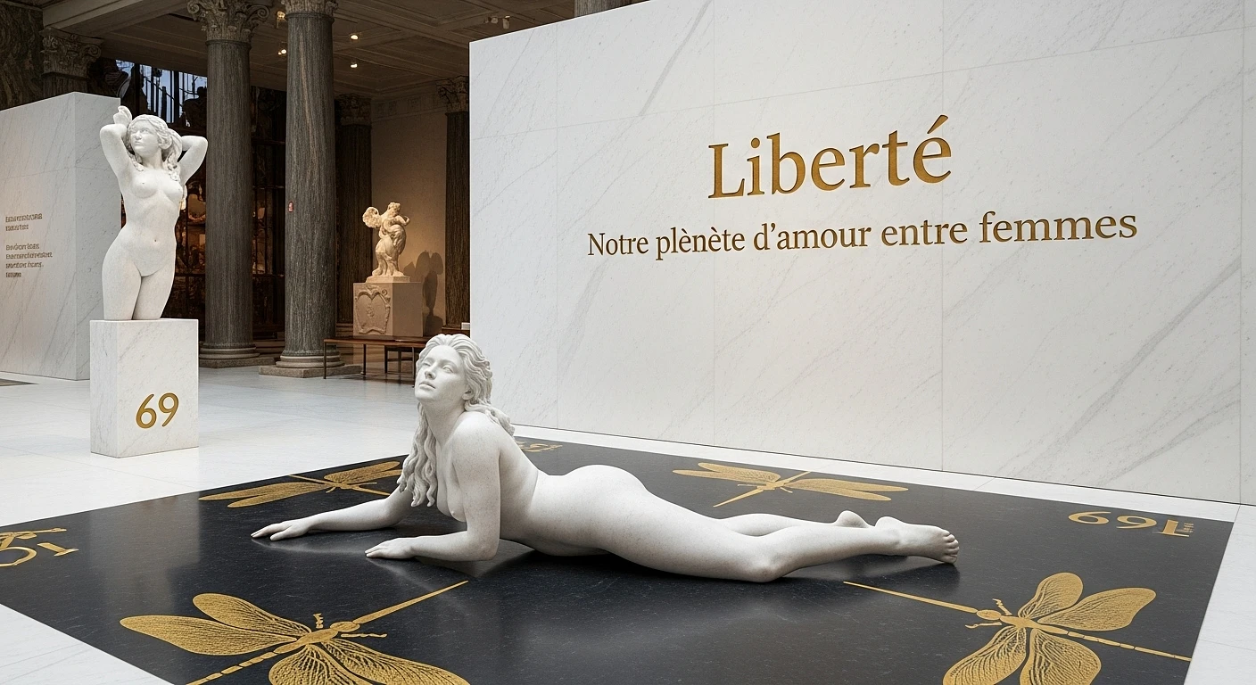 Photo. in a art Musea. a wall of white marmer with the text in gold "Liberté" and "Notre planète d'amour entre femmes", in a Temple background and art Rubbens paintings, Musea of all time, a big marmer statues of one marmer lesbian lover in real soft grey marmer, statues of a verry detailed wild woman fulgair loving, feeling an playing with herself intence scantily dressed in marmer, scantily dressed, lie on the black marble floor, correctly position sixty-nine, all in white marmer with a golden Dragonfly print repeat in the marmer floor, -- real prof photo