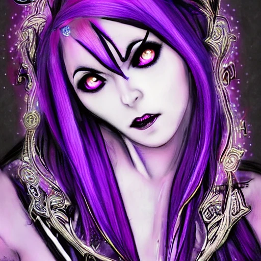 Lilith, beautiful face, neon purple flowing hair, manga cover, mystical, dark gothic, stunning, dreamy, ethereal, hypermaximalist, elegant, ornate, luxury, as Maleficent