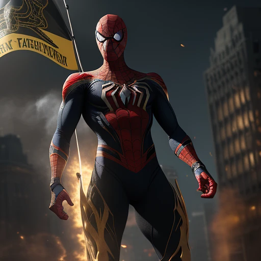 Photo of 8k ultra realistic spiderman with yellow war flag banner, full body, intricate yellow and black armor, ornate cinematic lighting, high definition, vibrant illumination, trending on art station, hyperrealistic, high details, focused, unreal engine 5, dark, lumen reflections, depth of field, photography, reddish war torn environment, smoke and embers, cinematic --ar 9:16