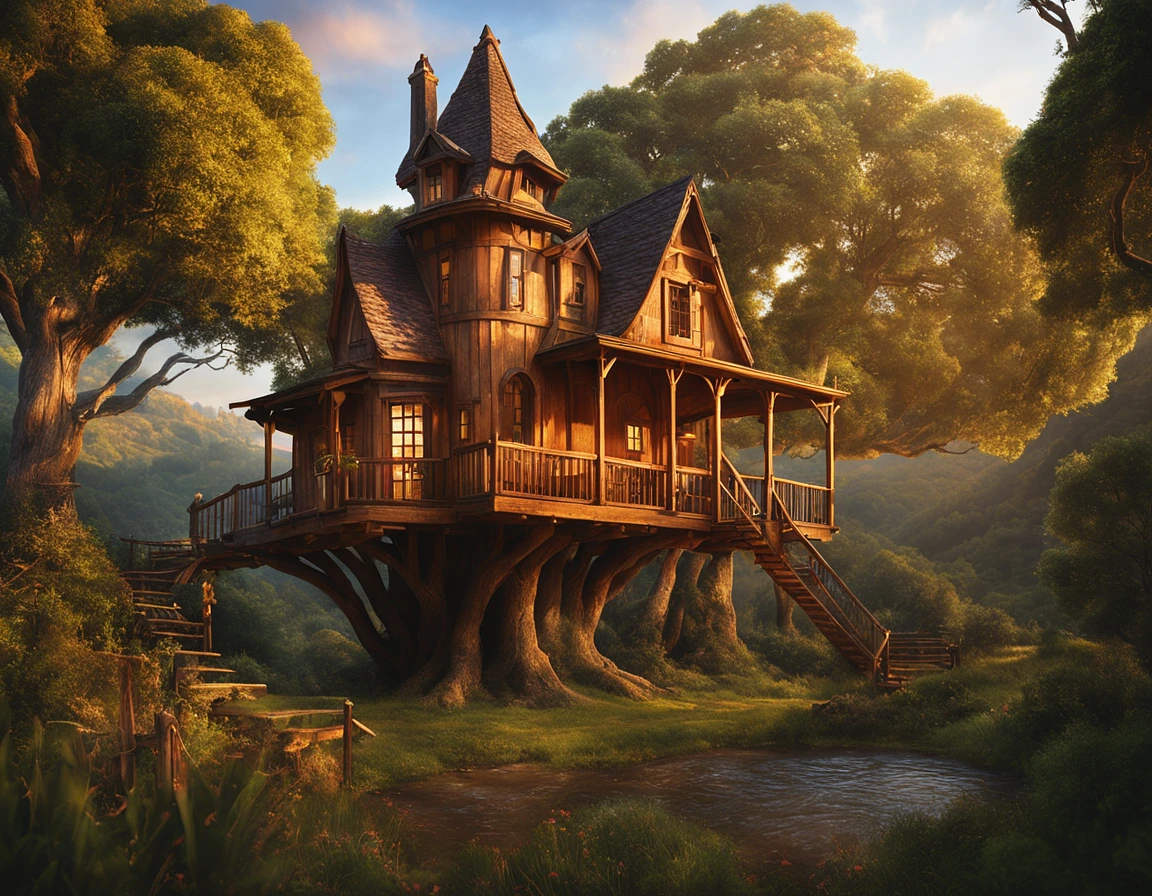 valley, fairytale treehouse village covered, , matte painting, highly detailed, dynamic lighting, cinematic, realism, realistic, photo real, sunset, detailed, high contrast, denoised, centered, michael whelan