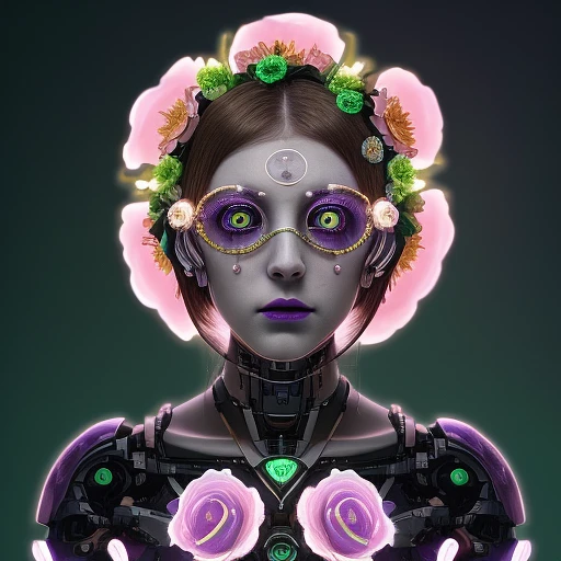ultra well detailed, rose, gold-tipped petals, green, purple, sapphire, woman's face, owl eyes, full body, cyborg, highfashion, flowers, future, hidden face, faceless, remove face, jewelry, -ray, neon, strange, weird, insane