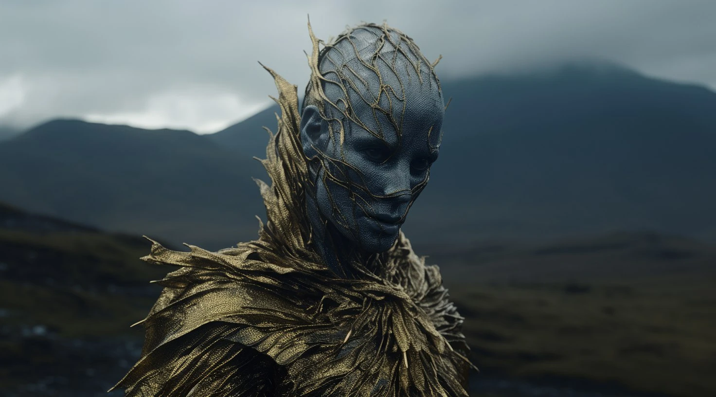 the character wearing a golden outfit is facing away from a rugged landscape, in the style of exaggerated facial features, dark silver and indigo, horror-inspired, 32k uhd, fantastic grotesque, light indigo and light green, mallgoth --ar 128:71