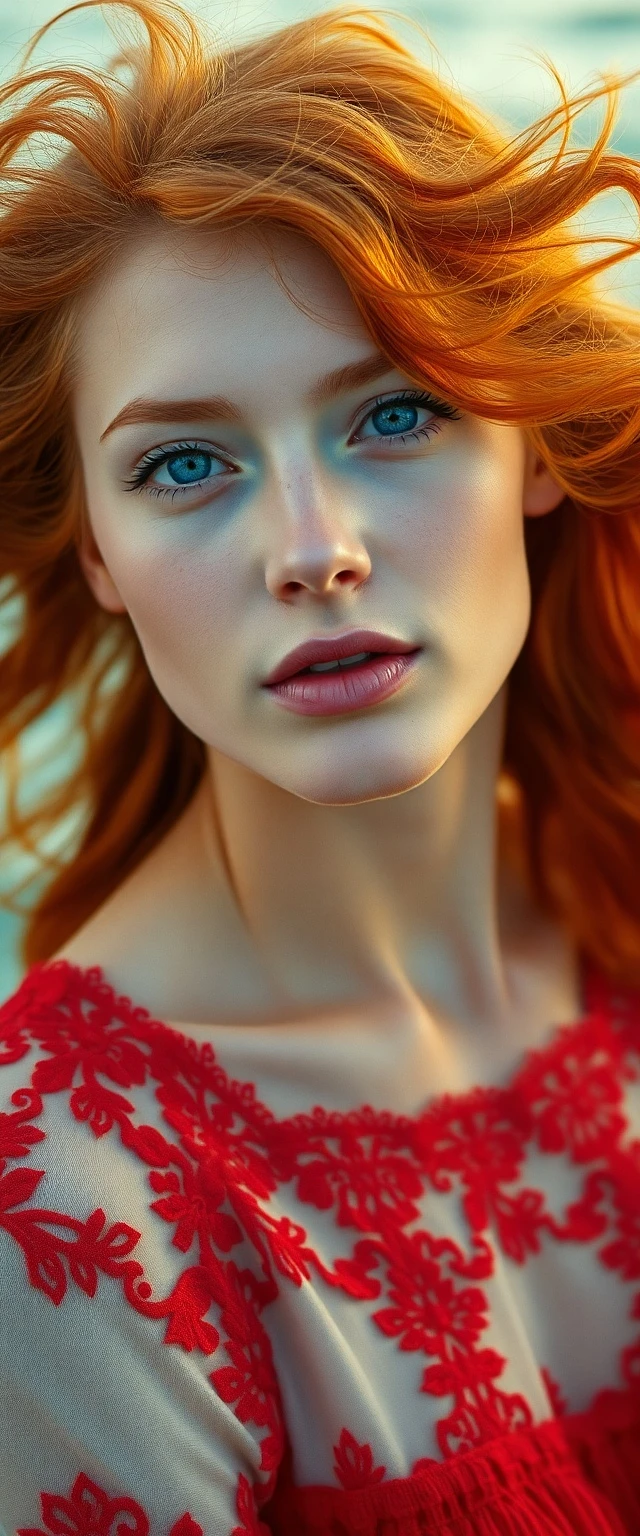 "Image is a high resolution close up head and shoulders portrait of a lithe redhead supermodel, fair complexion, voluminous copper red hair, soft curls, blowing in a strong breeze, vivid sapphire blue eyes, parted full pink lips, serene expression. Cinematic style, golden hour light, soft pastel colours, crisp scarlet lace dress over scarlet petticoat. Turquoise ocean backdrop, soft, gentle light, fashion based composition, editorial style, soft contrast and saturation. "