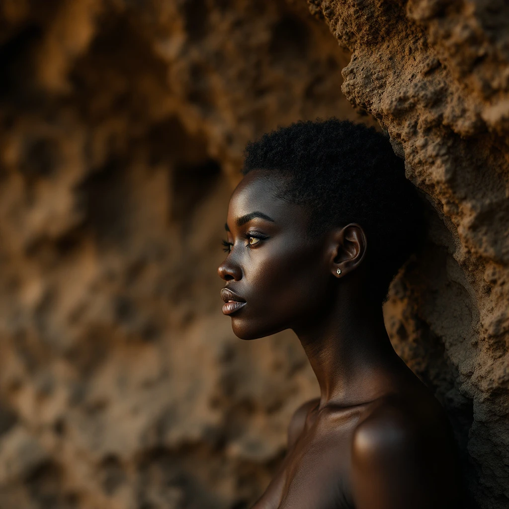 Portrait of an androgynous Black woman with short natural hair, seen in a calm two-thirds profile. Her ear is clearly visible, her skin illuminated by a soft, warm directional light. No makeup, no jewelry, no accessories. The background is made of natural, sculpted textures: eroded stone, volcanic rock, raw sand layers, or cracked mineral surfaces in earthy tones (deep browns, charcoal, ochre, warm greys) . Her expression is quiet, grounded, and strong. The overall atmosphere is intimate, elemental, and timeless — evoking a sacred connection with nature. Editorial composition, ultra-detailed, cinematic softness, minimalist style.