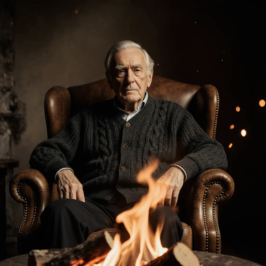 a cinematic portrait of a silver-haired elderly man in a charcoal cable-knit cardigan in soft amber firelight against a worn leather armchair beside crackling logs with floating ember sparks drifting across the mid-ground, evoking gentle nostalgia atmosphere; ultra-shallow depth, razor contrast, fine skin detail, subtle film grain, cinematic color grade, high-res DSLR editorial look.