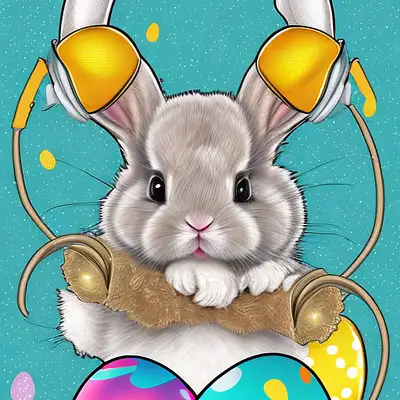 easter, cute baby bunny with earmuffs in winter wonderland sticker in a easy vector style, happy, glowing lights, no watermark, 8k, high detail, high resolution, comics, inking, graffiti art, graphic, golden ratio composition, 8k, black background, no watermark, intricate detail, high resolution
