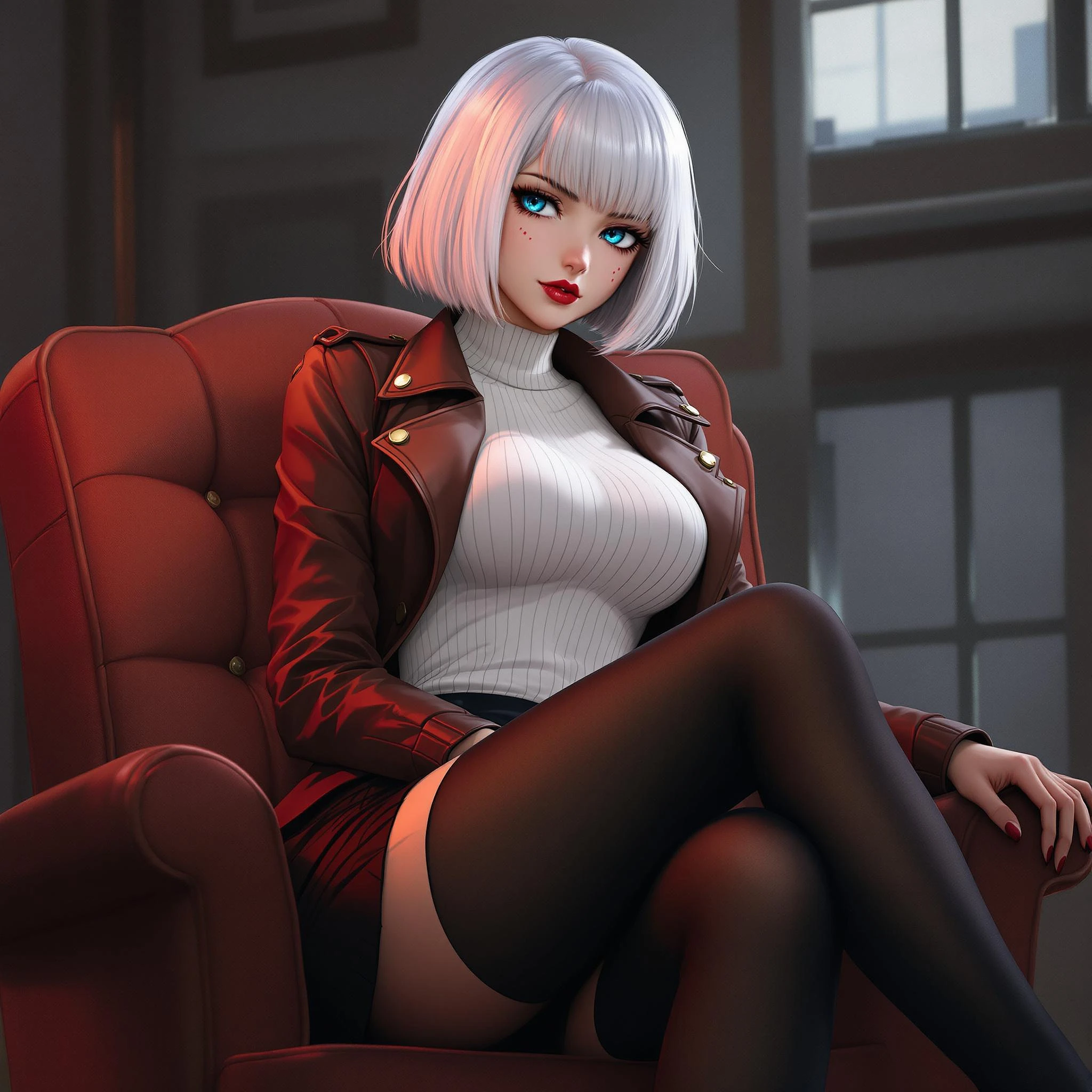 anime, woman, white hair, bob cut, blue eyes, freckles, red lips, white sweater, tight sweater, short leather jacket, brown leather jacket, black tight skirt, black stockings, black high heels, stern expression, sitting on a chair, sitting with legs crossed, big chest