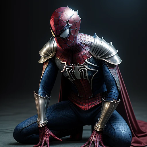 wearing costume spiderman, kneeling dog knight, portrait, finely detailed armor, intricate design, silver, silk, cinematic lighting, dramatic lighting, 4k