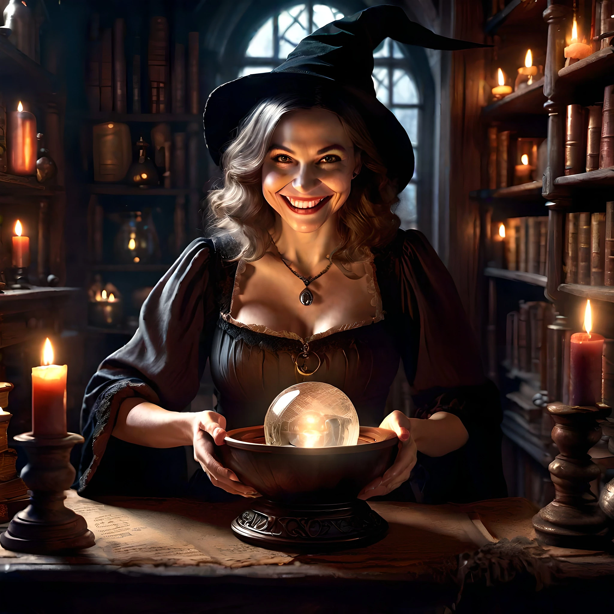 a beautiful photo of a witch grinning maniacally as she holds her hands over a crystal ball, cauldron in the background, potions on shelves, old wooden house, books and old scrolls, 8k, sharp intricate details, masterpiece, imaginative, raytracing, octane render, studio lighting, professionally shot photo, hyperrealistic, ultra high quality, realism