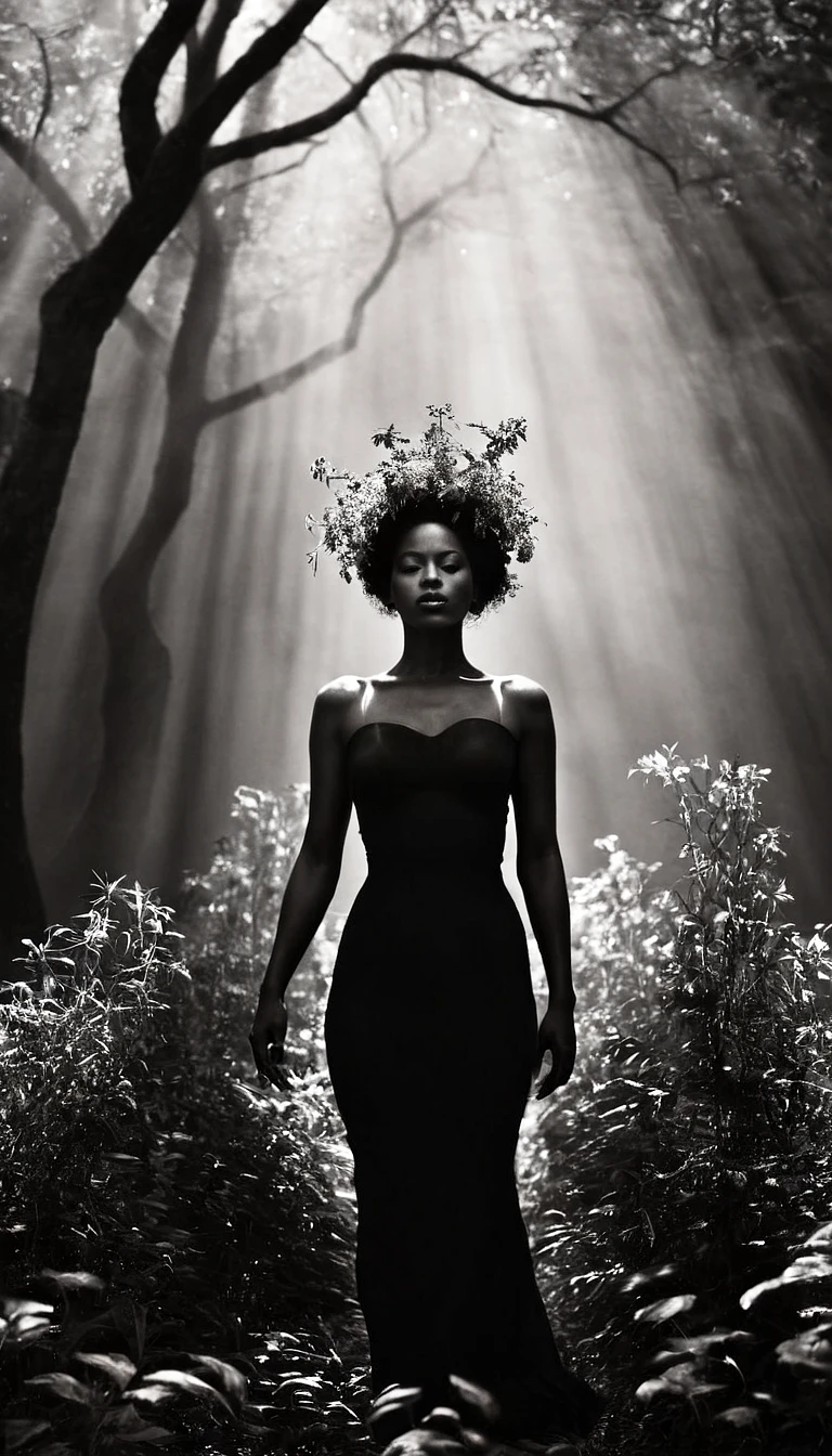 black and white photography, fashion editorial, a conceptual illustration of black woman as mother of nature in sunlit forest, rays of light, dramatic sky, light and shadows, art concept, highres, realistic photo, professional photography, cinematic angle, dynamic light back shining,