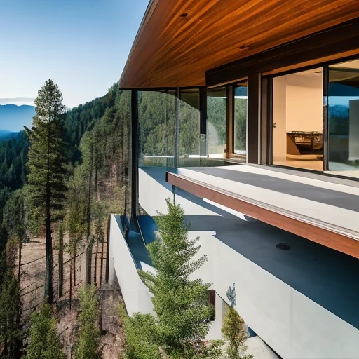 Drone view of a modern, minimalist dream home nestled in the mountains, with clean lines and a neutral color palette, with floor-to-ceiling windows offering stunning panoramic views of the surrounding wilderness