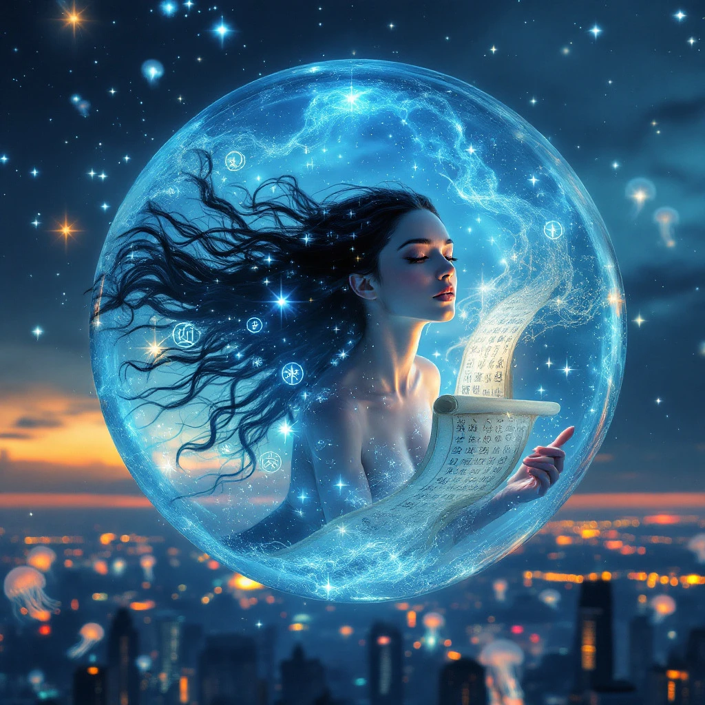 Suspended in a translucent water sphere floating above a city in twilight, a dolphin-human hybrid channels star signals into ancient symbols on glowing scrolls. Her hair flows like ink in zero gravity, her body partially phased into multiple dimensions. Stars reflect in her eyes. Background: fading starlight, translucent jellyfish, blurred neon skyline far below. Style: liquid surrealism meets spiritual sci-fi.