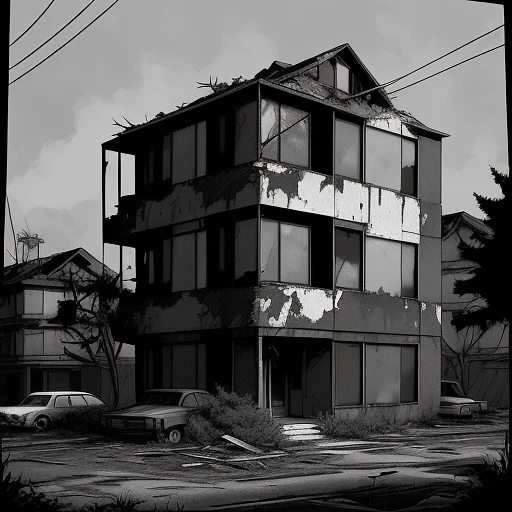 Illustration in manga style a desolate scene of an American suburban condominium, abandoned for years in the post-apocalyptic world of 'The Last of Us, ' . Traditional-style houses are overrun with wild vegetation, with trees piercing through broken roofs. Rusty cars lie scattered across deserted streets. Use strong contrast and detailed line work to capture the eerie quiet and abandonment, with the setting sun casting dramatic shadows over the scene, emphasizing the once peaceful neighborhood now lost to nature.