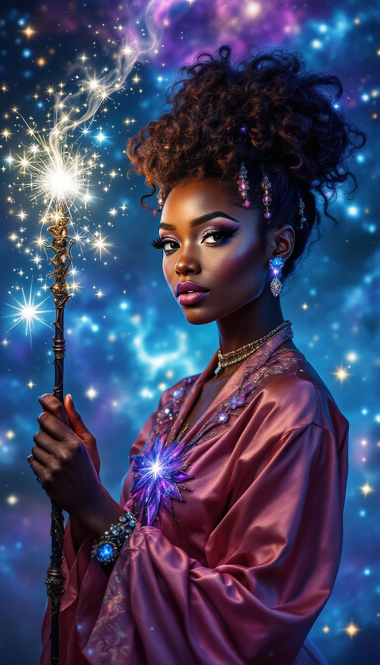 "Nebula Weaver with Whimsical Grace": A vibrant image captures a stunning woman with an enchanting aura, skillfully wielding a luminous rod against a backdrop of a star-filled sky. Her dark, chocolate skin glows with a soft light from the distant stars, and she strikes a captivating pose, with her elaborate hairstyle and striking outfit presenting a mix of playfulness and charm. The innovative blend of fantastical elements and detailed realism by the artist brings this stylish mystic to life, creating a sensation in the digital art world.
