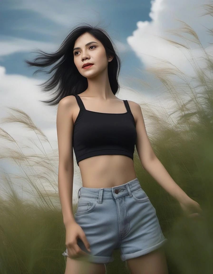 photograph of a woman standing in an overgrown grass field, (from below, low angle:1.2) , long brunette hair blowing in the wind, looking away, light makeup, wearing a sleeveless crop top showing off her fit midriff, long pants, sneakers, dynamic pose, cloudy sky, midday, (hyperdetailed:1.2) , HDR