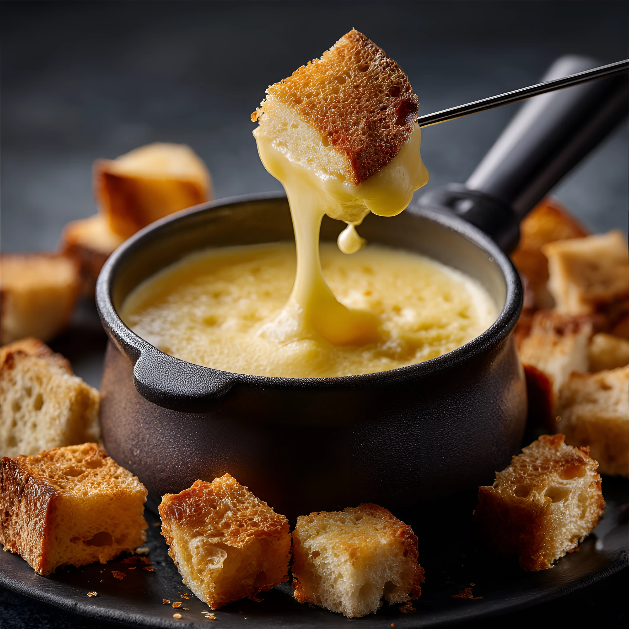 melted cheese fondue in a dark-colored pot, dripping cheese onto a toasted bread cube on a metal skewer, dark background, golden-yellow cheese with a smooth texture and subtle bubbles, crispy, golden-brown toasted bread cubes scattered around the pot, shallow depth of field focuses on the cheese and bread cube, rich, warm lighting highlighting the cheese and bread, high-angle close-up view, delicious looking food
