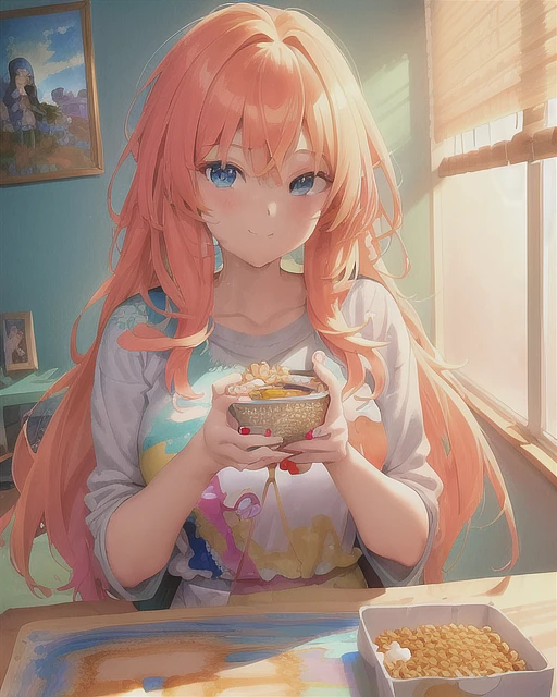 A beautiful girl eating cereal for breakfast in her room. The painting is anime, professionally color graded, 8k HDR, vivid, bright, anime faces, hyper resolution, depth of field, and created by Artgerm, Greg Rutowski, and Alphonse Mucha with volumetric lighting. The painting has very bright colors and uses anime faces that are not distorted.