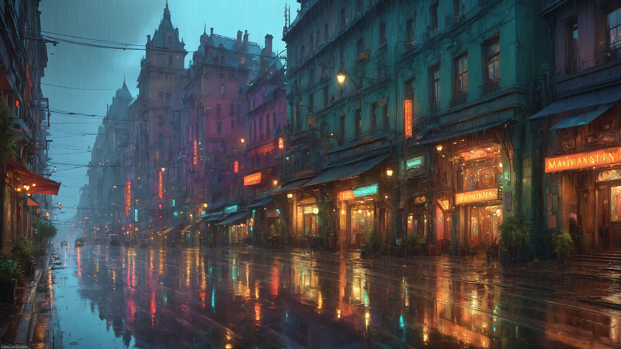 road, buildings, colorful lights, raining, rain, reflections a fantasy digital painting, artstation, concept art, art by greg rutkowski and alphonse mucha, hyperdetailed, high resolution, realistic lighting, volumetric lighting, art by seb mckinnon, trending on artstation, intricate artwork by maxim verehin