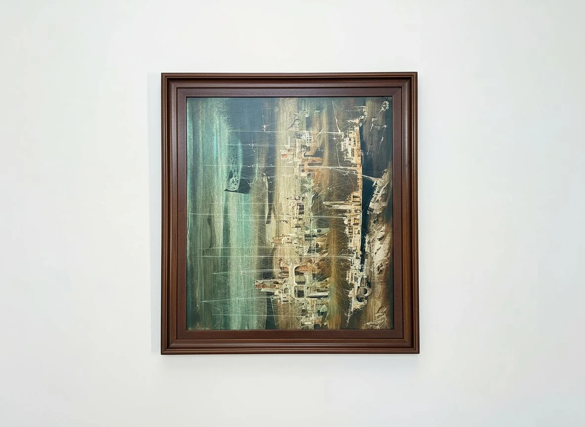 make this painting be the center of a close up, horizontal, studio photo in a whitewall gallery setting. the painting takes 90% of the photo. the painting is horizontal.