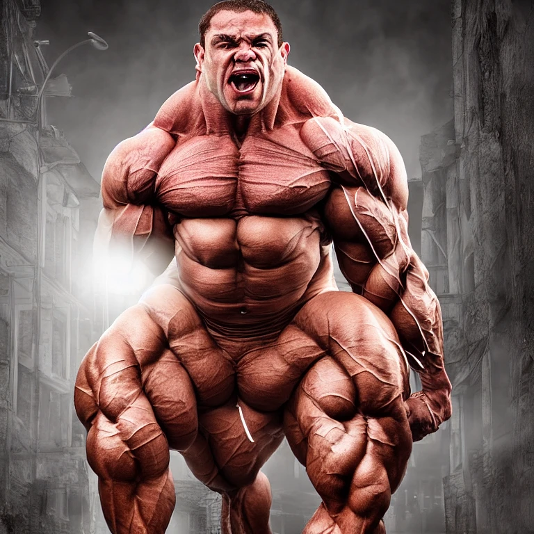 Realistic photo of an enormous muscular monster with massive pecs and biceps breaking a building while posing his vascular muscles, pecs bulging out with veins, biceps bulging, bulk psysique, 4k, extreme quality, very detailed, ambient lighting