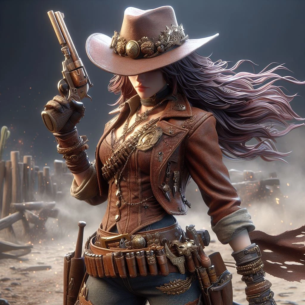 an ultra-realistic 3D rendering of cowgirl Miss Fortune from League of Legends, featuring detailed Western attire with a tattered brown leather jacket, worn jeans, and a dusty cowboy hat adorned with authentic trinkets. High-res textures and advanced PBR shaders ensure precise material representation, enhancing visual fidelity. Dynamic particle effects, like dust trails and weapon glows, contribute to the Wild West ambiance. The 3D environment showcases a picturesque Western