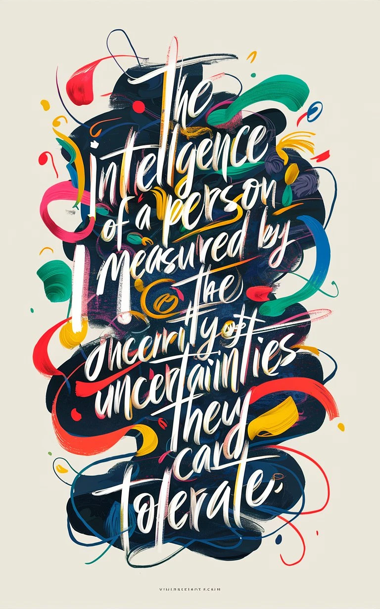 Abstract Calligraphy Prompt: Create an abstract calligraphic work that visually represents the quantity of uncertainties a person can tolerate. Use organic shapes and lines to create a dynamic and balanced composition. Experiment with different brush sizes, bright colors, and textures to add depth and dimension to your piece. Be sure to incorporate the citation "The intelligence of a person is measured by the quantity of uncertainties they can tolerate" into your design. , typography