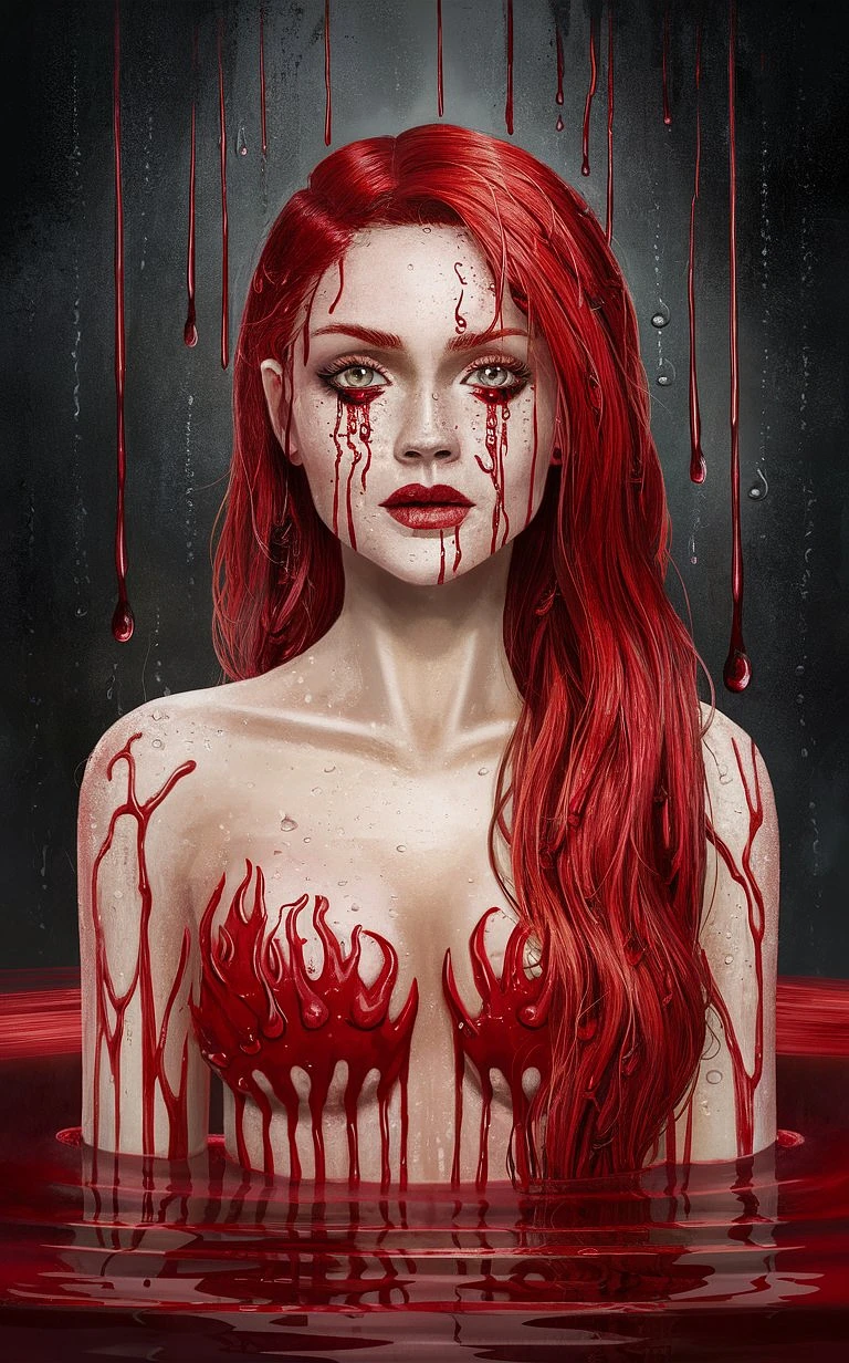 A full body portrait of a woman made of blood, half body is submerged in blood, red long hair depicting a waterfall, drops of water on the face and body, tears of blood