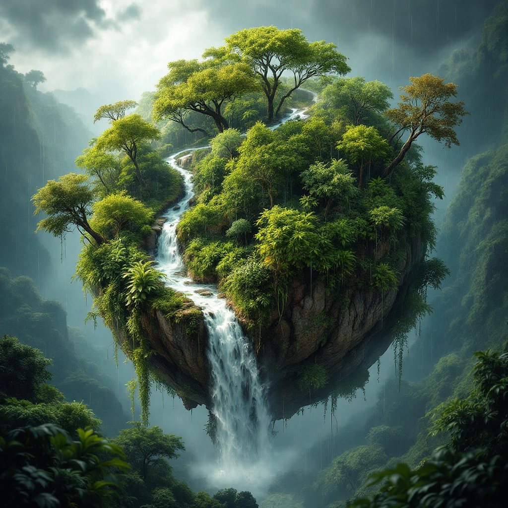A floating microplanet reveals a dense jungle, its surface overgrown with thick vines and towering trees, all tightly packed onto the small orb. A swollen, fast-moving river snakes around the planet’s edge, its roaring currents crashing against jagged rocks, while heavy rain pours down from dark storm clouds. The jungle feels alive with the sounds of wildlife, as vibrant foliage bursts from every angle, and ancient trees lean over the water's edge. The entire scene is a compressed yet dynamic slice of nature, where the chaotic energy of the wild jungle is squeezed onto this tiny floating sphere, its lush vegetation battling against the relentless downpour. طريق بجانب وادي العشرات الكثيفة من الياسمين الطريق اوراق الياسمين زهرة خشبية صورة مشوهة روعه الطرق كلة اوراق شجر الأشجار وأوراق زهرات خزف حقيقي،الباستيل،على غرار مارفل،ضوء الشمس،معالجة ما بعد محرك Unreal Engine Octane فائق الواقعية