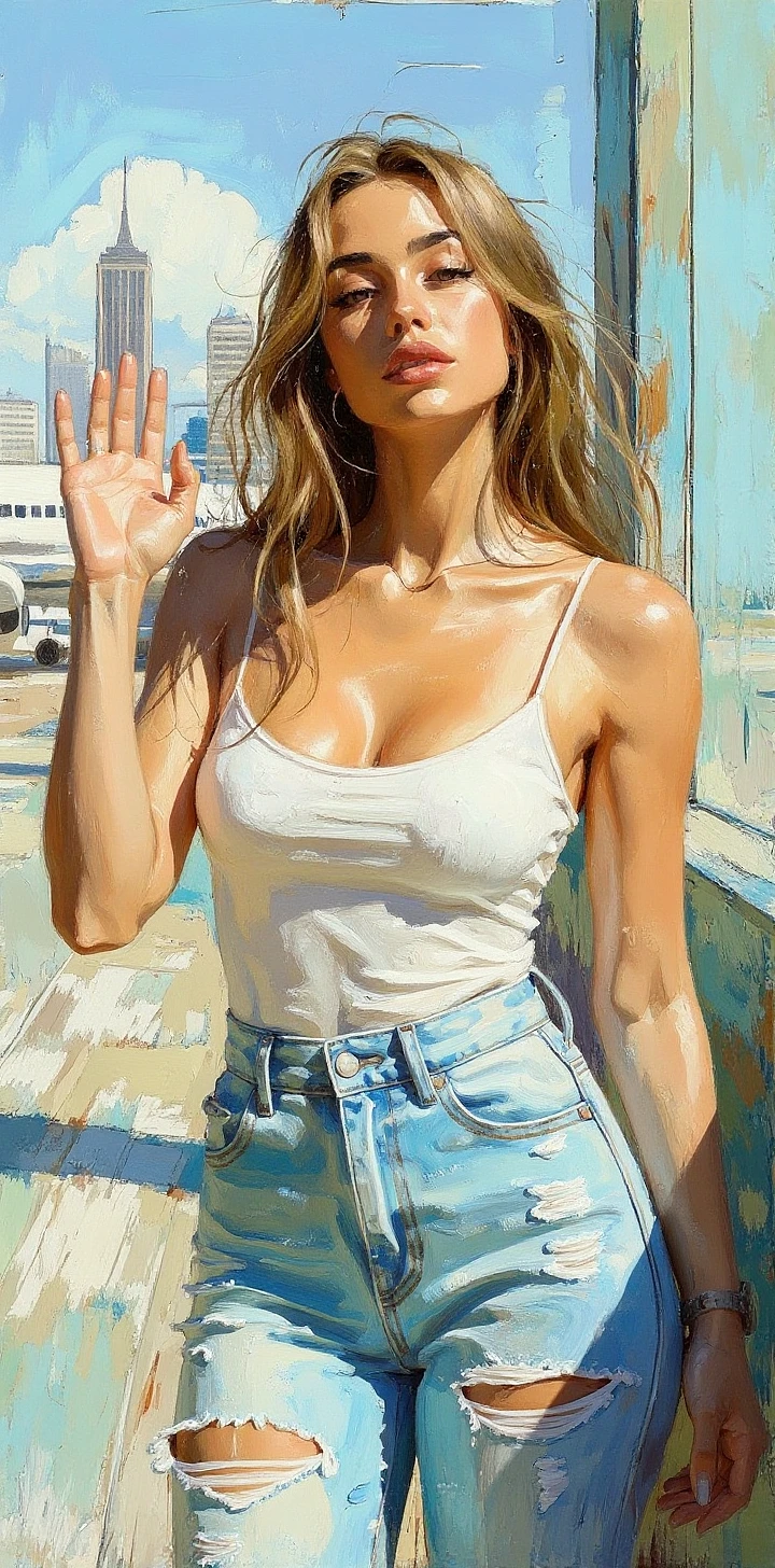 a painting of a woman in the JFK airport , waving goodbye to NY, wearing jeans and a tank top, in the style of beautiful women, playfully intricate, heavy impasto, i can't believe how beautiful this is, romantic flair, close-up --ar 1:2 --personalize yruxpc2 --stylize 750 --v 6. 1