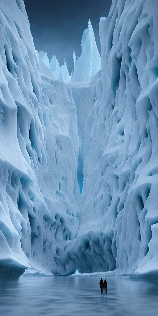 Multiple connecting tunnels in antartica bellow thin ice, multiple people moving around the tunnels, The wind chimes of years ago floated in the still overcast day, a light leaking from my ears, buzzing, distant glaciers rushing towards me. facinating and imposing, fantasy digital art, octane render, beautiful composition, trending on artstation, award-winning photograph, masterpiece