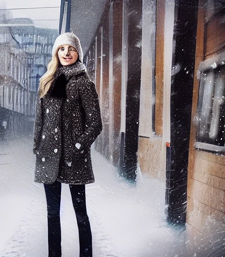 professional portrait photograph of a gorgeous Norwegian girl in winter clothing with long wavy blonde hair, sultry flirty look, (freckles) , gorgeous symmetrical face, cute natural makeup, wearing elegant warm winter fashion clothing, ((standing outside in snowy city street) ), stunning modern urban environment, ultra realistic, concept art, elegant, highly detailed, intricate, sharp focus, depth of field, f/1. 8, 85mm, medium shot, mid shot, (((professionally color graded) )), bright soft diffused light, (volumetric fog) , trending on instagram, hdr 4k, 8k