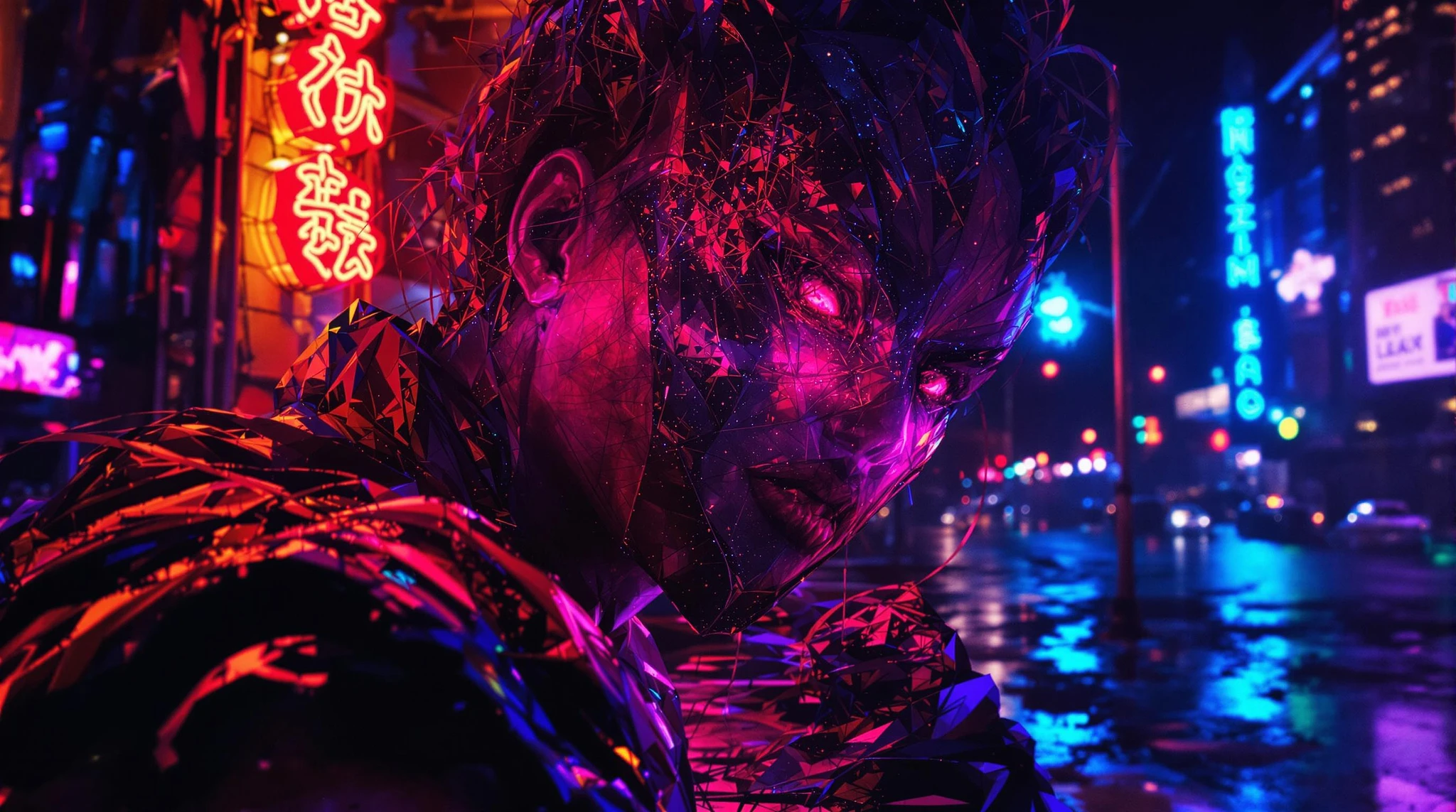 Now, people always say I ain't livin' right But it ain't my fault you misplaced your light Replaced your wife with some 2 bit floosie Now she's gettin' flucked up in Detroit city. Close-up. Vibrant, neon-lit digital painting. muted colors in the background with a touch of autumnal orange and yellow. High-contrast, cinematic lighting with deep shadows and neon highlights. Best quality, incredibly detailed, vivid and surreal, dark fantasy, eerie atmosphere, old movie theater aesthetic, vibrant colors, neon glow, digital art, concept art, sci-fi illustratio