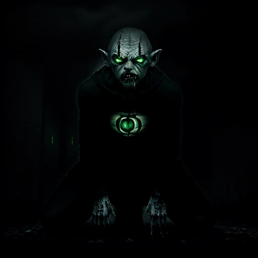 alone in the darkness, broken, kneeling and looking down, full body, no face, (psychopathic:0.8) , brutal composition, gloomy, intense dark tones, leaving an indelible and haunting impression on psyche, gollum, glowing green lantern eyes,