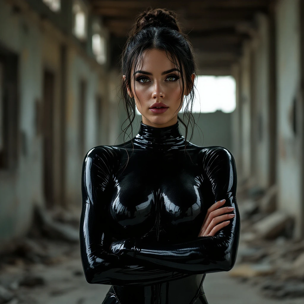 The image is a close-up of a woman wearing a black latex bodysuit, standing in a dilapidated building with her arms crossed, looking to forward.