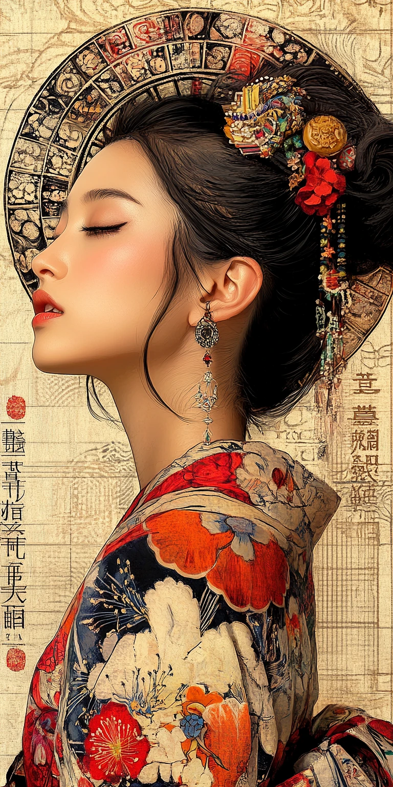 a green, white, and red oriental painting, feminine beauty, in the style of botanical impressions, muted tonalities, traditional oriental backgrounds --chaos 75 --ar 1:2 --style raw --profile rsy6uq9 --stylize 750