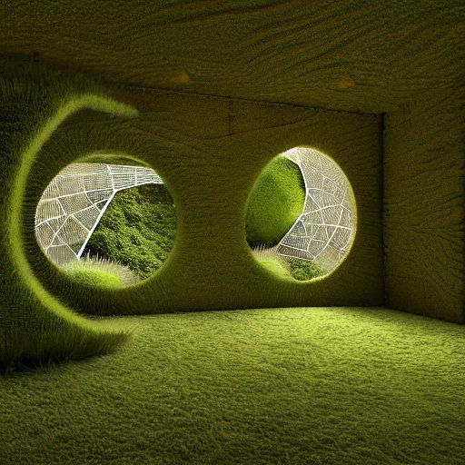 Realistic architectural rendering of an organic capsule inside wooden blocks organic design with moss and high rounded windows with lights inside, human scales, fog like London, elegant and generative design, nest, mesh structure, silkworm thread patterns, realistic , designed after Kengo Kuma, Sou Fujimoto, cinematic, unreal engine, 8K, HD, volume twilight, windows reflecting light, zaha hadid, ilustration