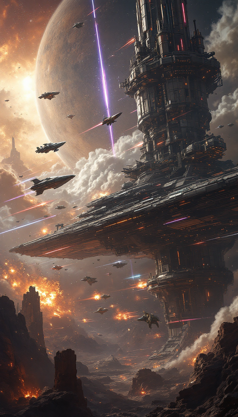 A breathtaking **sci-fi battle scene** unfolds on a **colossal, war-torn space station** orbiting a **dying star**, where the fate of an entire civilization hangs in the balance. **Gigantic battleships**, **sleek fighter crafts**, and **monolithic war mechs** engage in an **intense, high-speed dogfight**, their **energy weapons slicing through the vacuum of space** in **brilliant neon streaks of red, electric blue, and pulsating violet.**