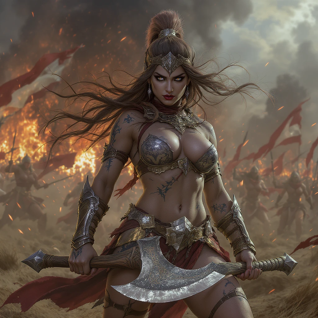 Datamoshing. Full body shot 3/4 view of a young beautiful tattooed and scarred female barbarian warrior with bare midriff and large axe in her hands, facing camera in a fighting action dynamic pose, a grand barbarian women's battle in the background --ar 4:5 --personalize qht7yza --stylize 750 --v 6. 1