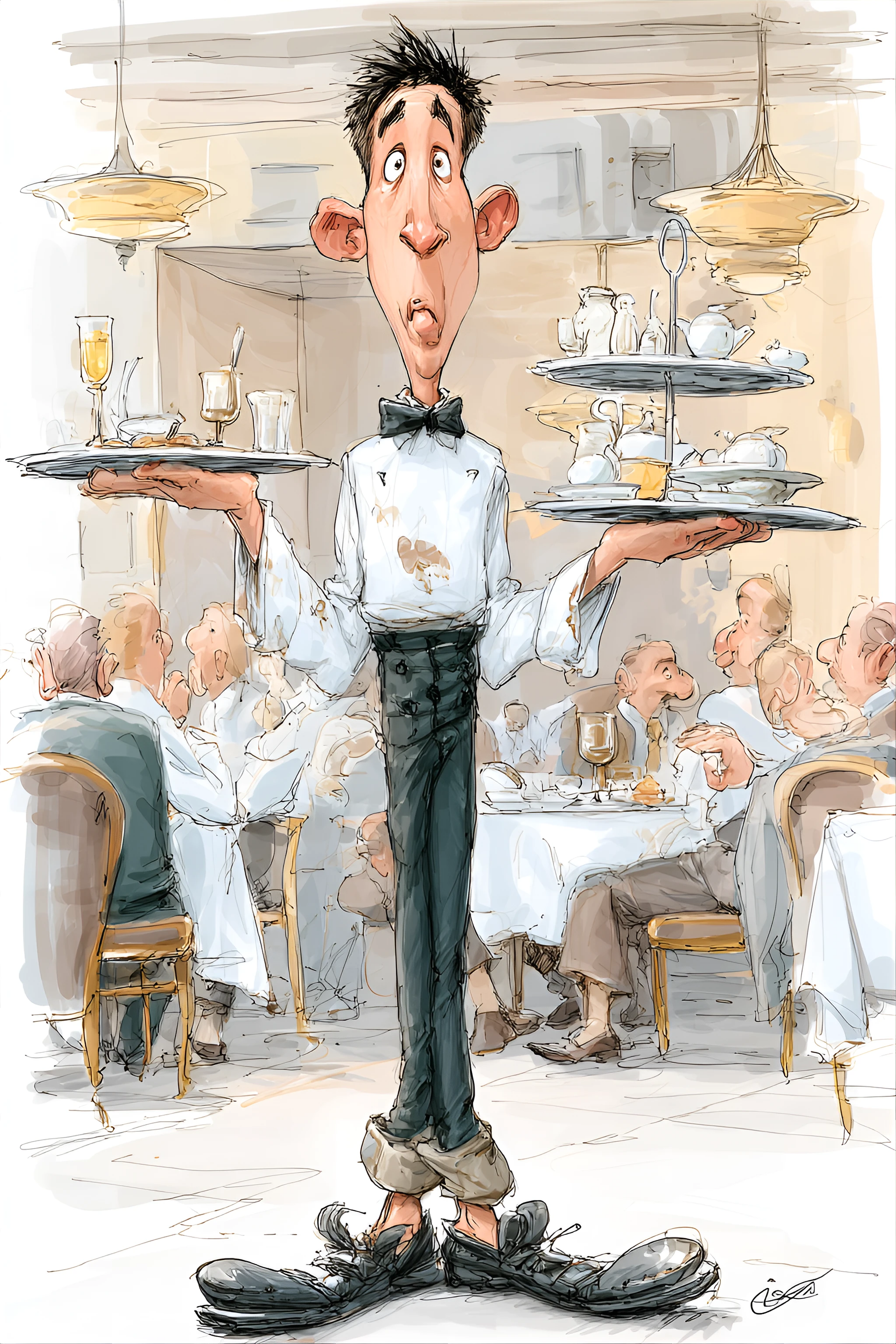 funny caricature, clumsy waiter, chinese ethnicity, 25 years old, nervous, eager-to-please, accident-prone, average height with exaggerated long legs and oversized feet, exaggerated caricature, gangly and uncoordinated body type, wide eyes, furrowed brow, prominent adams apple, anxious expression, the waiter is wearing a white dress shirt with multiple food stains, black bow tie askew, wrinkled black pants, and scuffed shoes, accessorized with a serving tray precariously balanced with teetering dishes and glasses, off-balance pose, busy restaurant interior with tables