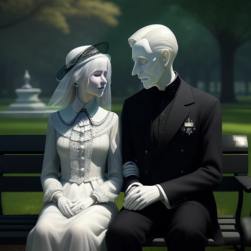 pristine, elite, fine, polished, show me a art photo painting of a man and ghostly woman sitting on a park bench in a park facing the camera, transparent holographic being, mourning family, she is about 70 years old, absolutely outstanding, image, ghostly necromancer, cgi animation, heartwarming, grieving, reassuring, remembrance, very detailed, beautiful, complex, highly intricate glorious colors, elegant, ambient, peaceful, lovely, perfect, sharp focus, extremely detail, professional, cinematic, singular, shining, epic, inspirational, pure, coherent, artistic, innocent, cute, colorful, incredible, vibrant, symmetry, divine, light, atmosphere, magic, illuminated, glowing, magical, pristine, elite, fine, polished,