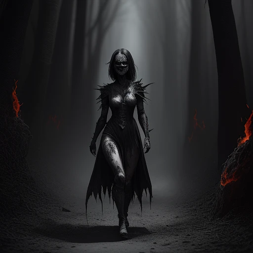 create image of woman, face teenager, style a demon woman, the very essence of evil. Her attire is something out of a horror movie, made of torns and ashes. She leaves a trail of fire wherever she walks. This scene is a mixture between dark fantasy and horror, full-body epic shot, cinematic lighting.
