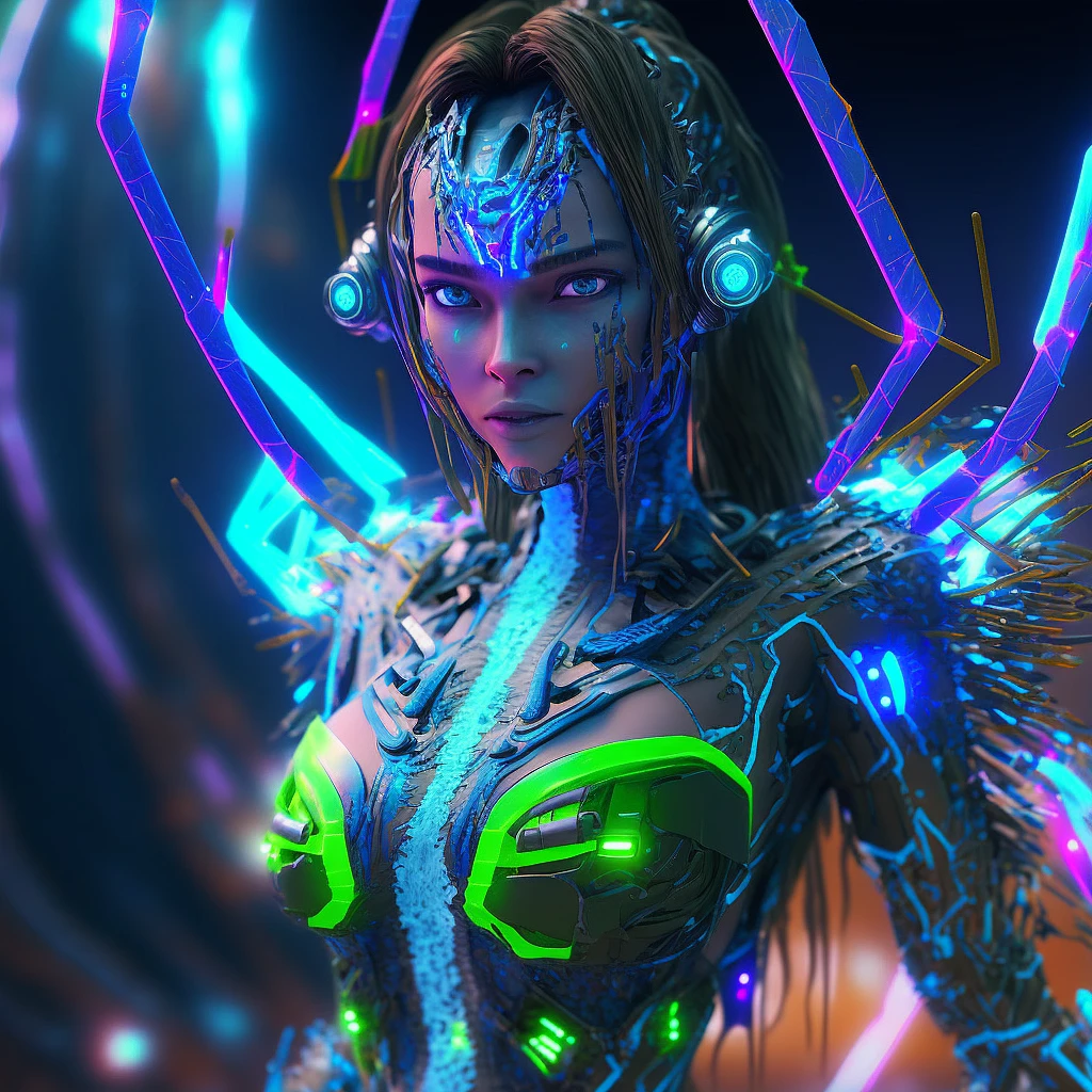 humanoid high detailed girl with neon accents, action scene, LED blue wiring in arms, futuristic fabric clothes on body, acid colors, ocean chaos background, character design, high-detailed masterful circuitry, photorealism, sci-fi, unreal engine, volumetric light, 8k, directed by Dennis Villanueva, by anime Trigger --v 4 --no blur --q 2