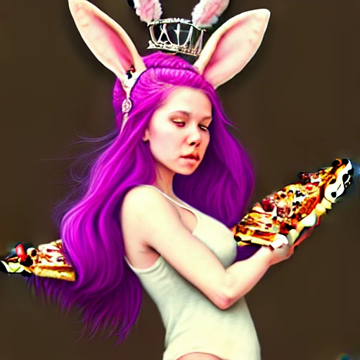 highly detailed portrait of a beautiful woman, side profile, with pink hair, pink bunny ears headband playboy, crown on her head, tight clothing, full body, holding a sweet baby bunny in her arms, bunny is eating pizza, stephen bliss, unreal engine, fantasy art by greg rutkowski, loish, rhads, ferdinand knab, makoto shinkai and lois van baarle, ilya kuvshinov, rossdraws, tom bagshaw, global illumination,