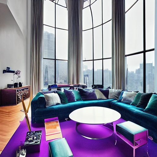 high resolution photography interior design, art deco dreamy sunken living room conversation pit, glass floor, large windows opening onto the city , bauhaus furniture and decoration, high ceiling, black blue purple palette, cyberpunk style, interior design magazine, cozy atmosphere