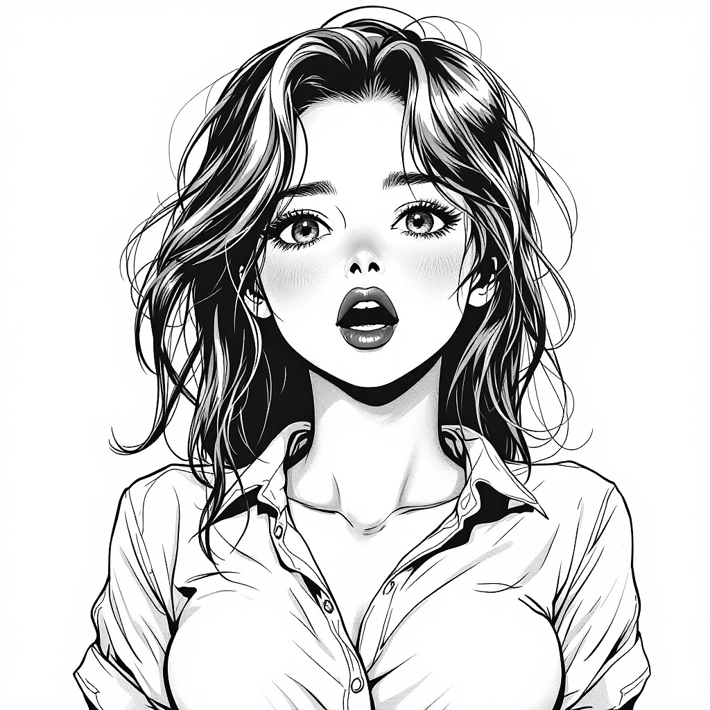 black and white portrait of a gasping blushing girl wearing a shirt, midriff, stunning beauty, in the style of detailed comic book art, 32k uhd, animated gifs, i can't believe how beautiful this is, cleavage, sideboob, stunning, glowing, flawless, surprised, detailed character illustrations, --chaos 75 --ar 1:2 --personalize yruxpc2 --stylize 750 --v 6. 1, petite, big gorgeous eyes, huge eyes