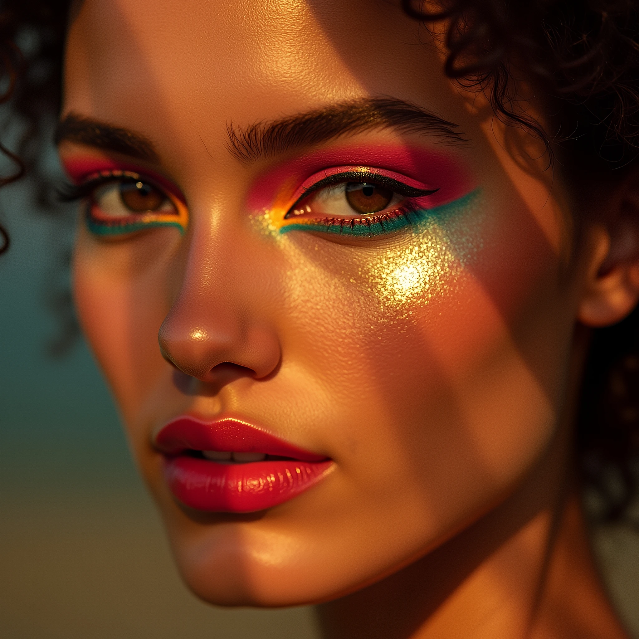 editorial beauty close-up of a 25-year-old Italian model with vivid orange lipstick, graphic two-tone eyeliner in hot pink and aqua, shimmering gold highlight, Canon EOS R3 + 100mm macro, rich lighting