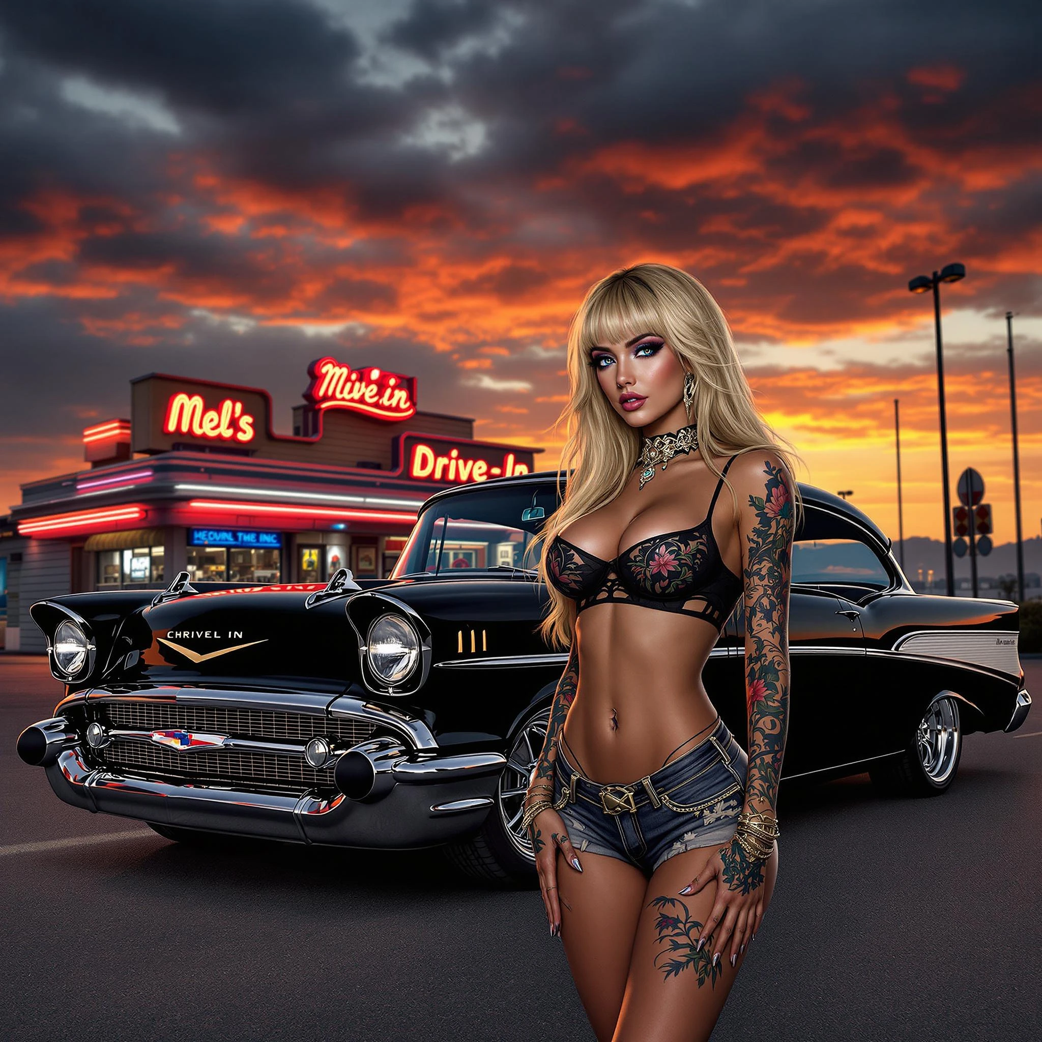 Hyper realistic, photo realism, zoomed out full body HD Photo of a black 1957 chevy Belair, with the rear end high enough that the rear wheels and tires are mostly exposed, front end is high enough for the wheels and to be exposed. All four wheels are Chrome reverse. A beautiful, sultry woman with colorful geisha tattoos on her arms, long blonde hair with bangs gently blowing in the breeze, dark sapphire blue eyes framed by long, elegant eyelashes and ornate blue and purple eyeshadow that compliments her eyes. She wears a crop top tshirt that barely covers her breasts. She has a bare belly and is wearing short cutoff jeans shorts. She is wearing an ornate gold and onyx belt and choker. She is standing next to the 1957 chevy. There are dark clouds moving in on the Reddish Orange sunset, there is a drive in restaurant with neon lights spelling Mel's Drive-in in the background. No poorly formed fingers, no extra arms, no extra legs, no extra fingers, no poorly formed hands, no poorly drawn body, no poorly drawn teeth, no bad anatomy.