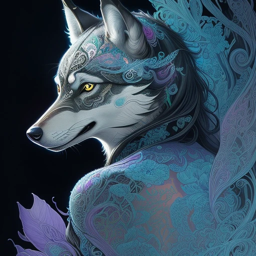 a beautifully intricate and detailed illustration of a wolf with Beautiful Neon Intricate Detailed Elaborate colored Art by Android Jones and Joe Fenton in the style of James Jean and Peter Max, Fantasy Art: floral, Intricate Detailed Elaborate Colorful Art, Fantasy Concept Art, Ridiculously Beautiful Art Nouveau, Digital Painting, Hyperrealism, Trending On Artstation, unreal mesmerizing colors, 8k sharp focus quality surroundings and highly detailed