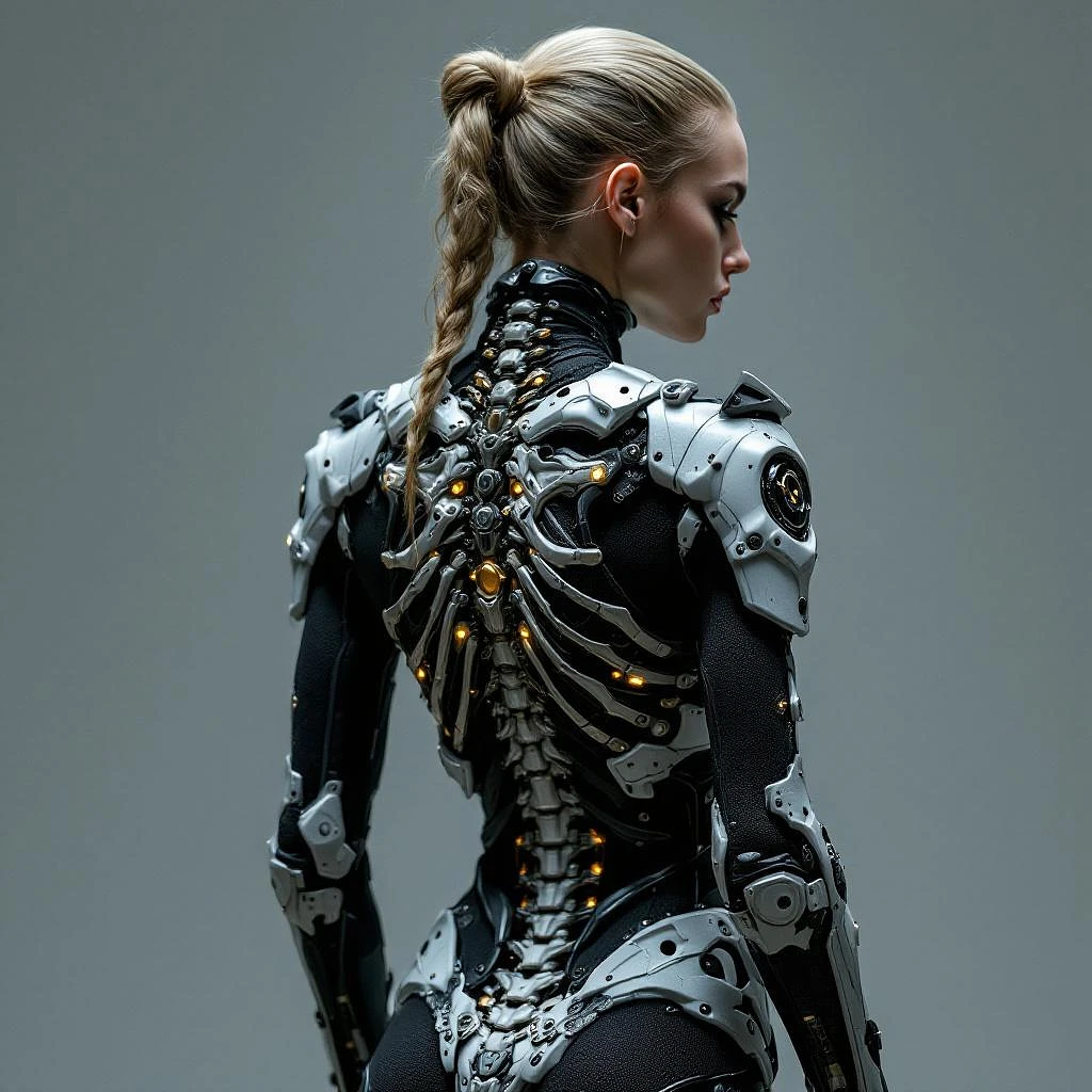 photography, woman model, 45-degree angle rear view, detailed exoskeleton jacket, inspired by skeleton, futuristic, sustainable materials, ambient lights effect, intricate textures, rich detailed --ar 9:16 --style raw --profile ue2yzjl --stylize 300 --weird 25